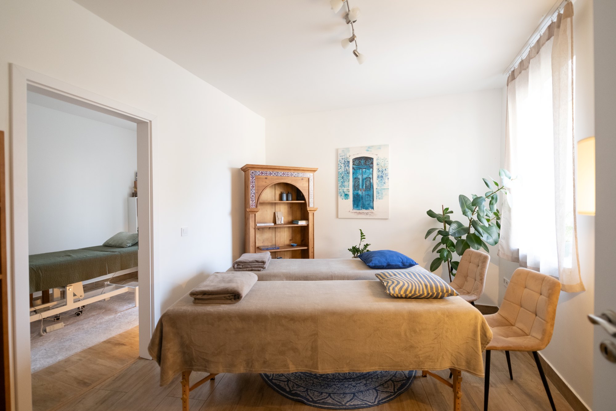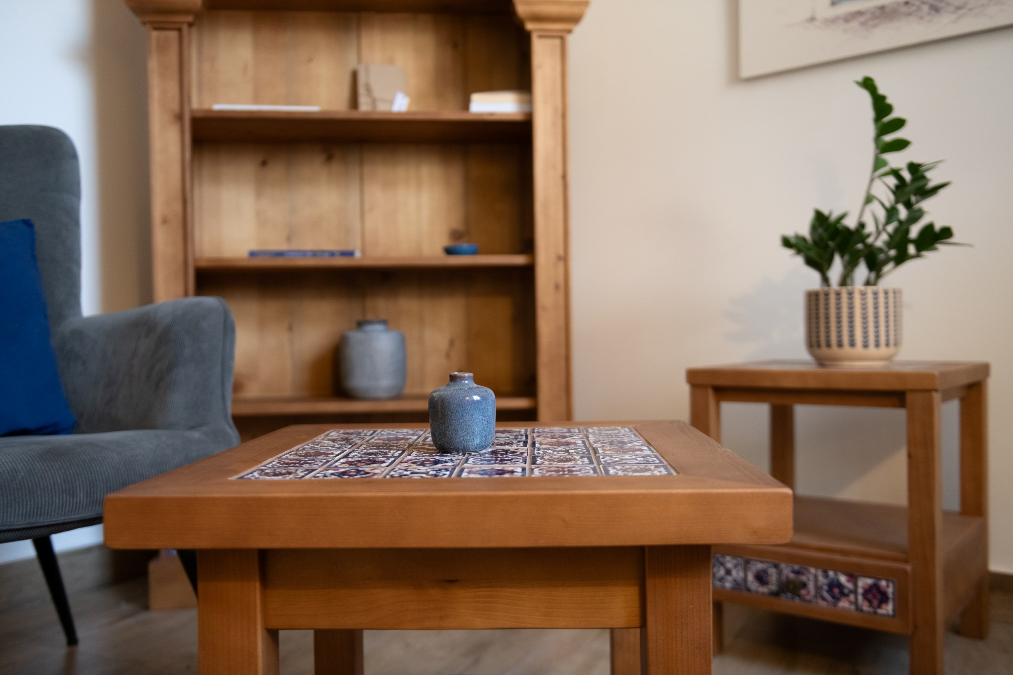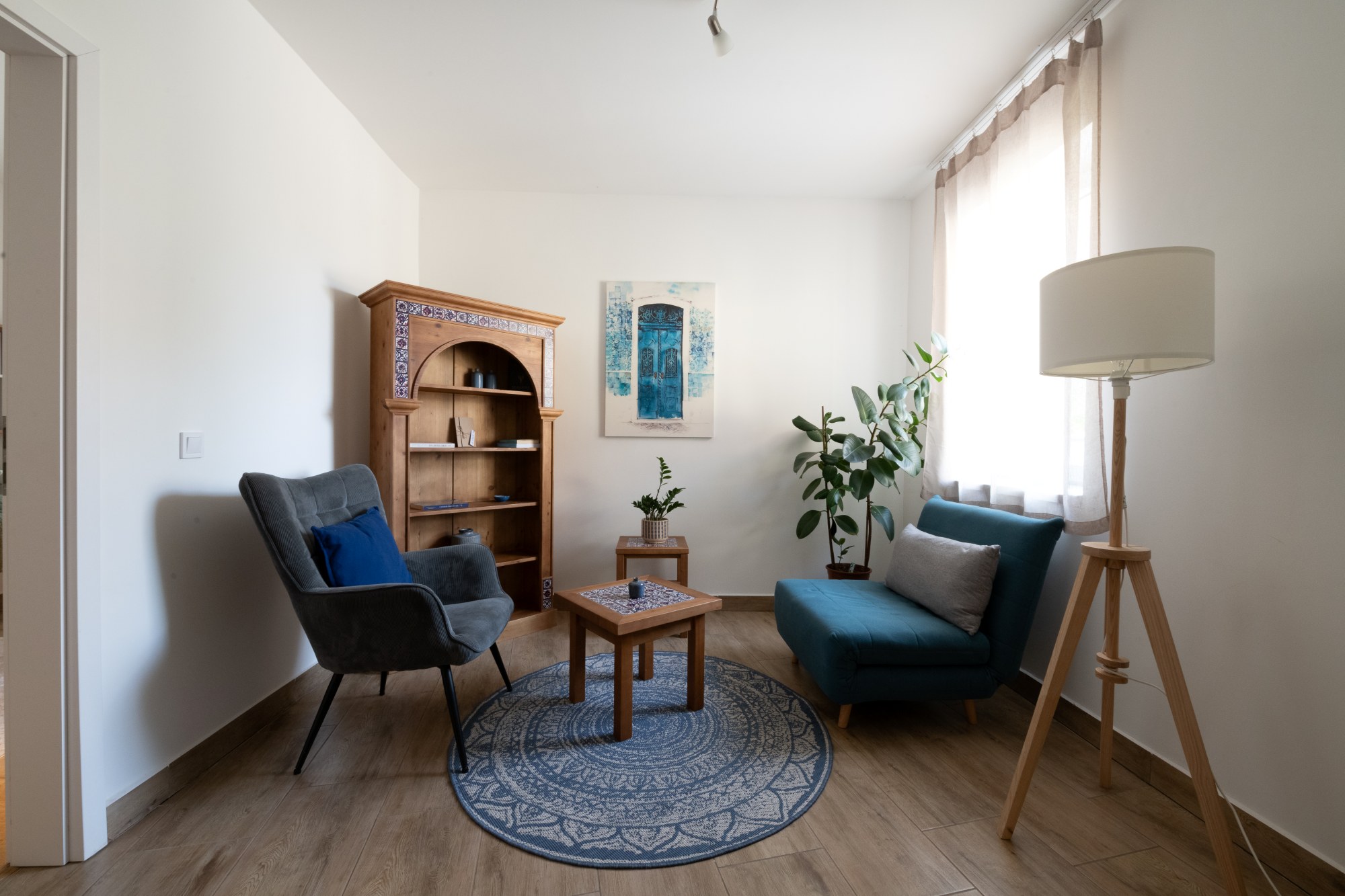 Az L2 STÚDIÓ Lapis szobáját a SYRA dizájnbútorok Stellare kollekciója díszíti. A részletgazdag berendezésen az apró égszínkék és terrakotta csempék a tengerparti naplemente színeit idézik fel.