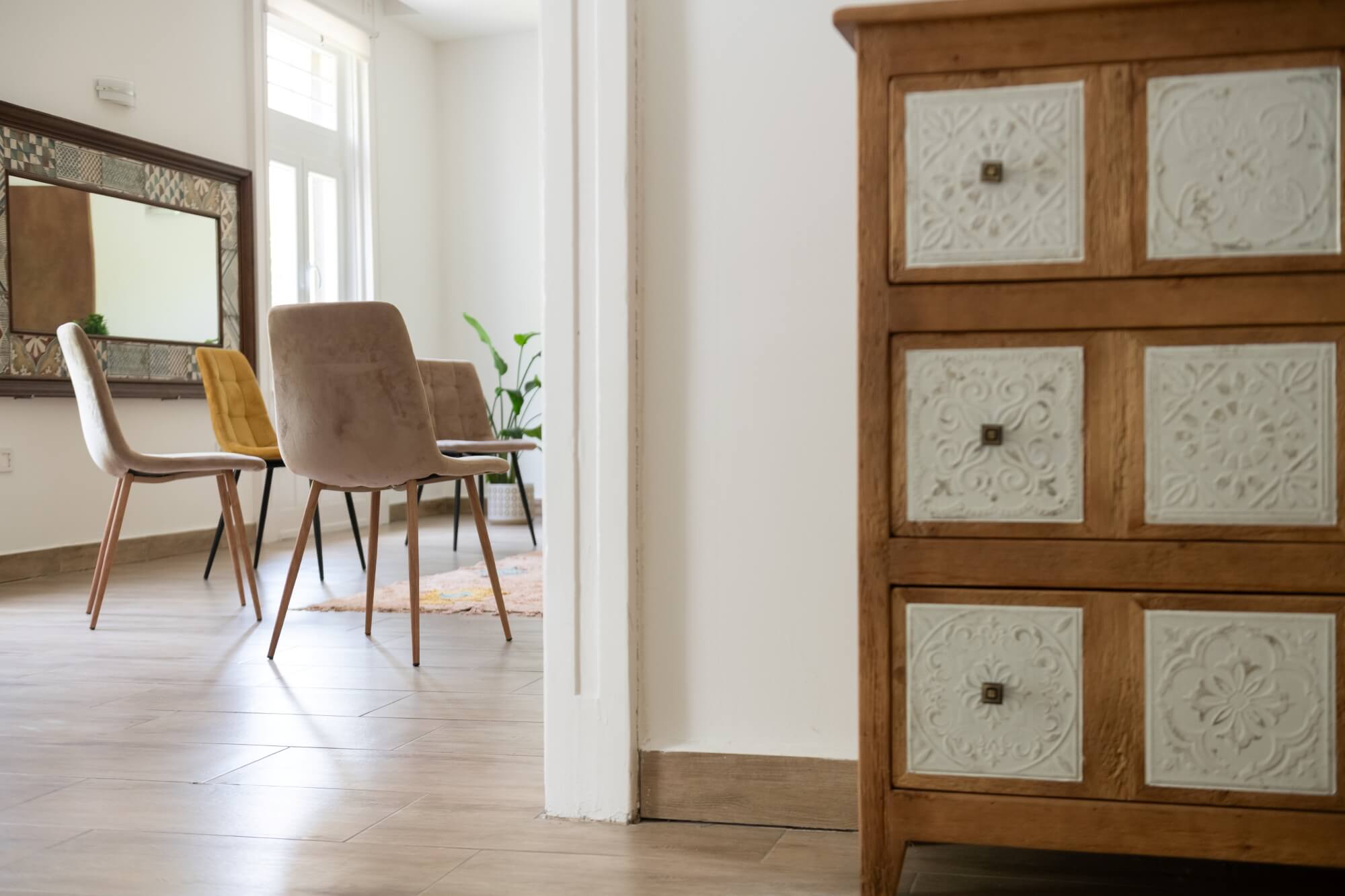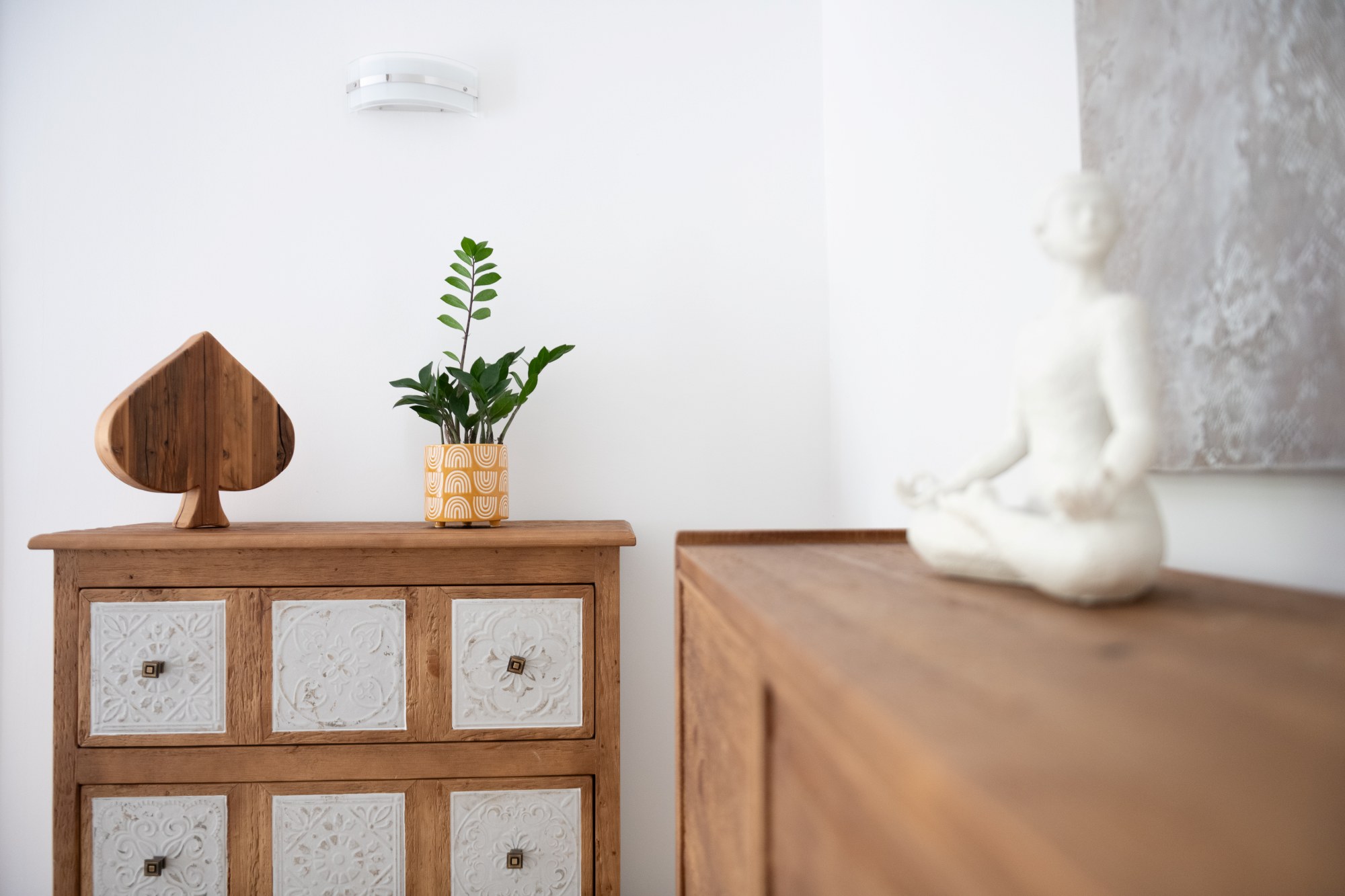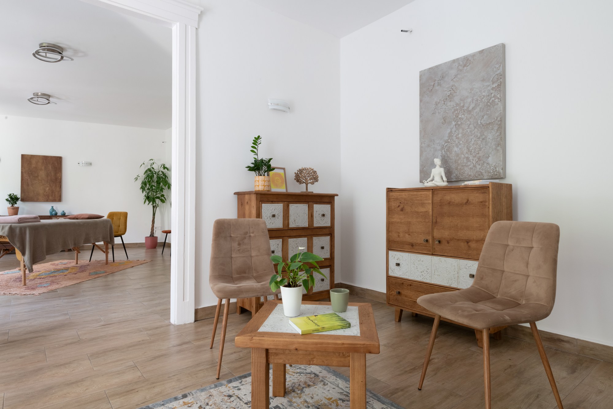 Az L2 STÚDIÓ Nude szobájának a SYRA dizájnbútorok Nude kollekciójának krémfehér, rusztikus hatású, szolidan hangsúlyozott mintái adnak éteri, elegáns hangulatot. Exkluzív, otthonos, és természetes.